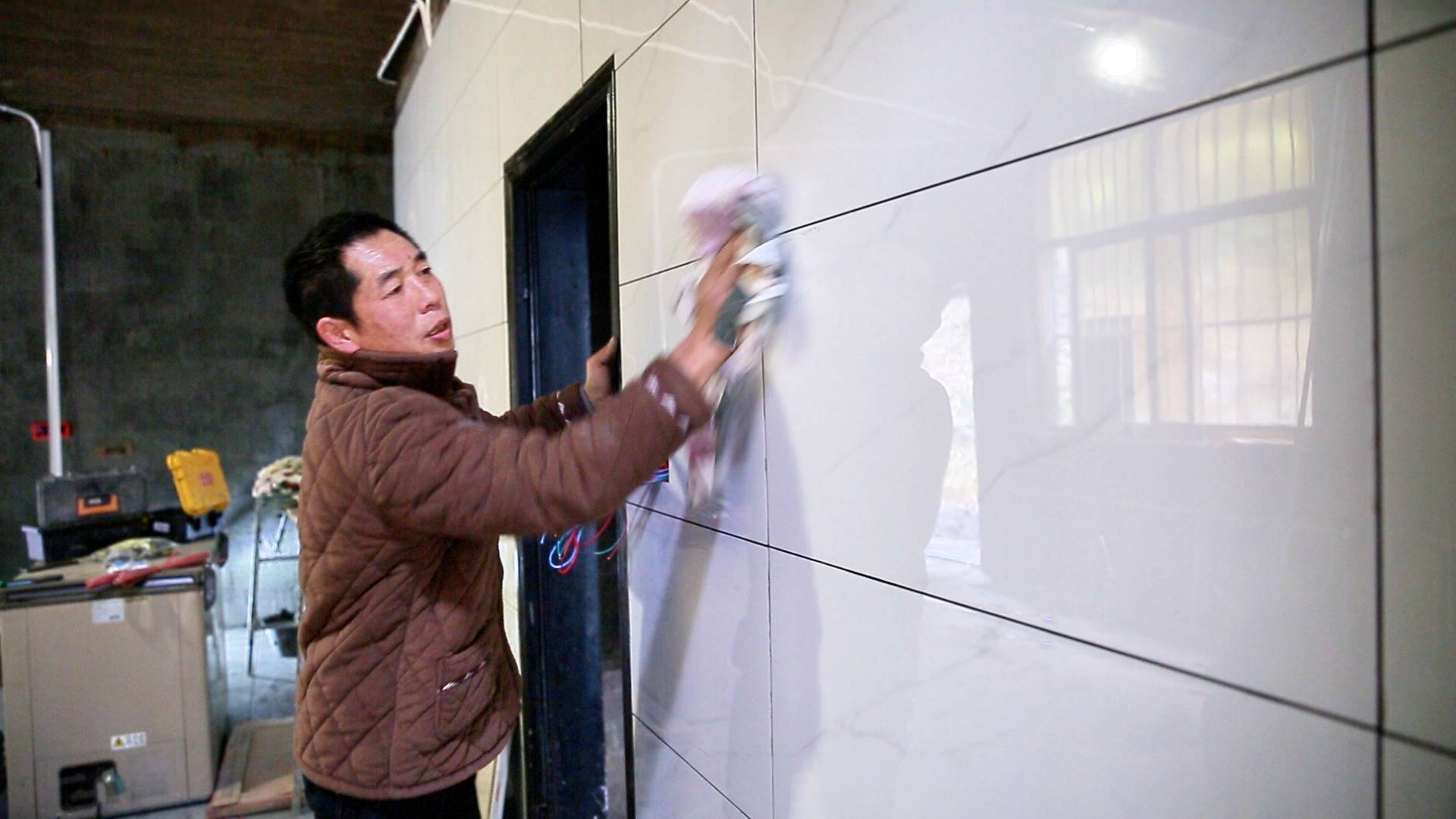 谭弟咸给厨房墙面贴磁砖。