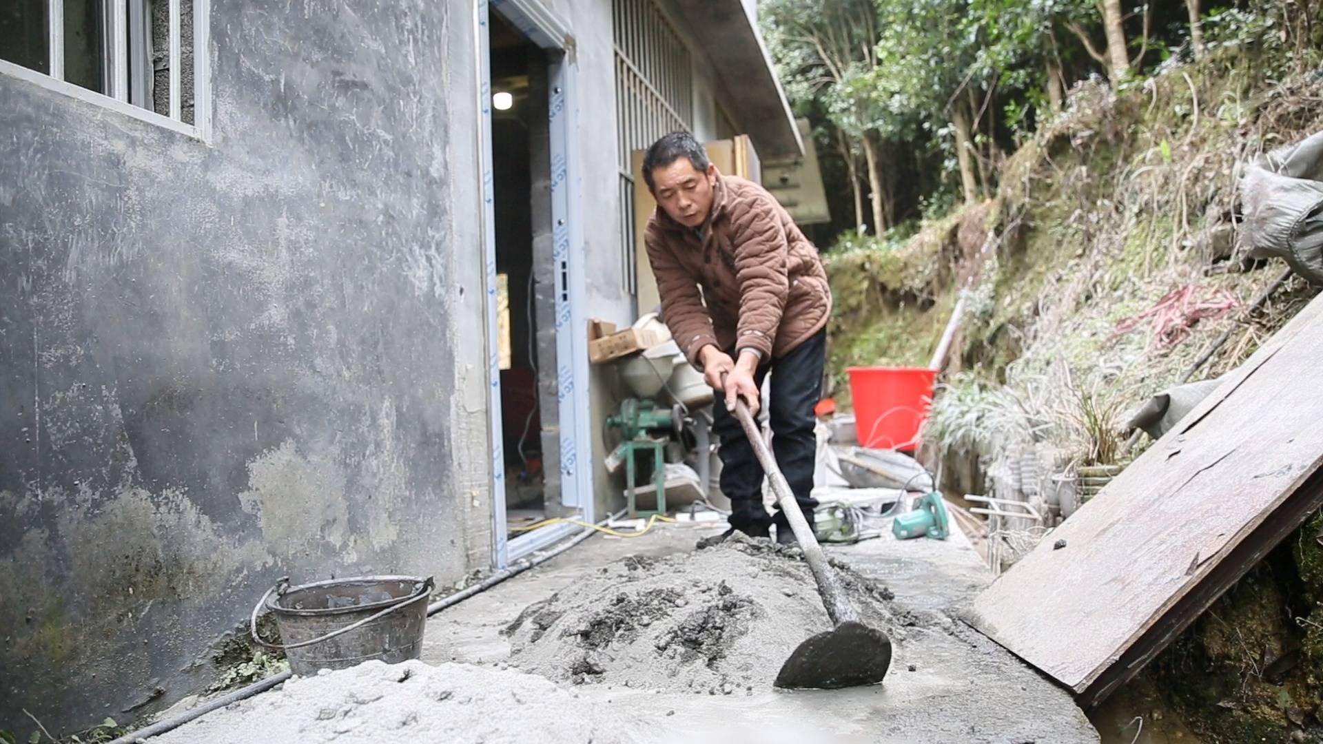 谭弟咸在家和水泥沙浆。